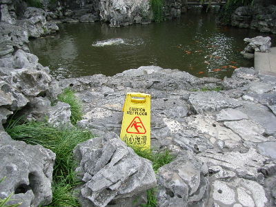 Besonders in Bezug auf Europäer und Amerikaner sind die Chinesen sehr zuvorkommend und sehr besorgt, dass ein falscher Eindruck ihres Landes entstehen könnte. Aus diesem Grund versuchen sie alles, um einem den Aufenthalt so angenehm wie möglich zu machen. Ein sehr schönes Beispiel dafür finde ich das folgende Bild. Mitten auf einem Felsen im Garten steht ein Schild mit der Aufschrift „Caution, wet floor“. Dieses Schild wurde aber nicht aufgestellt, da die Steine wegen des Teiches nass sein könnten, sondern weil hier unmittelbar vorher frisch gewischt worden ist.